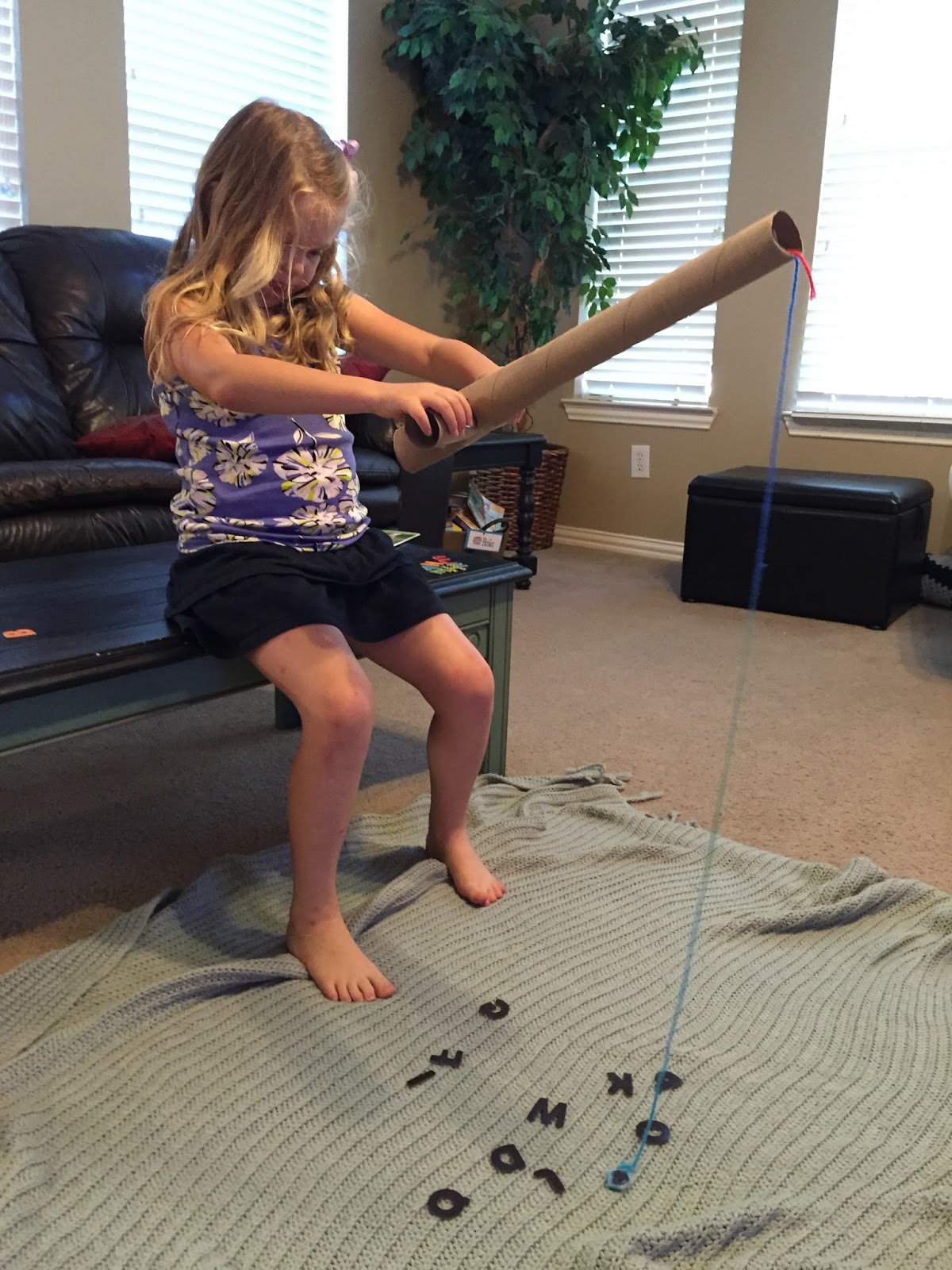 Then we were ready to go fishing! They really got into it. I had them sit on thecoffee table dock and put our blue-green blanket down for the water, of course.